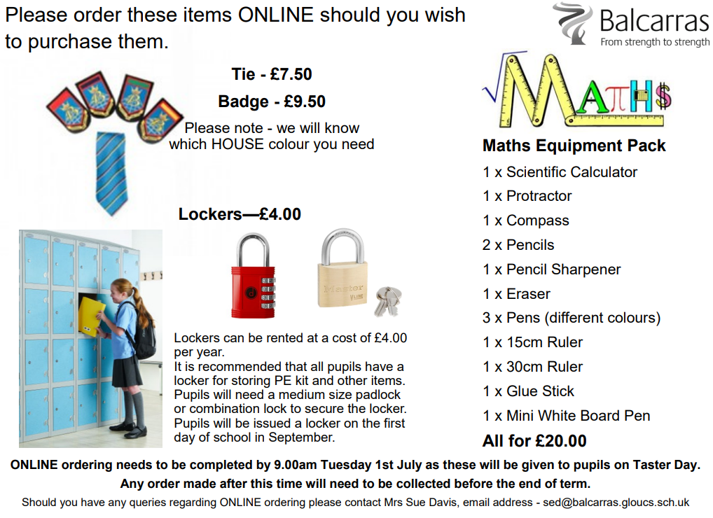 In the information that we will send out prior to taster day (letters will be posted on Thursday 26th June 2025, you will find all the information needed to set up your scopay account for purchasing of the items listed below.