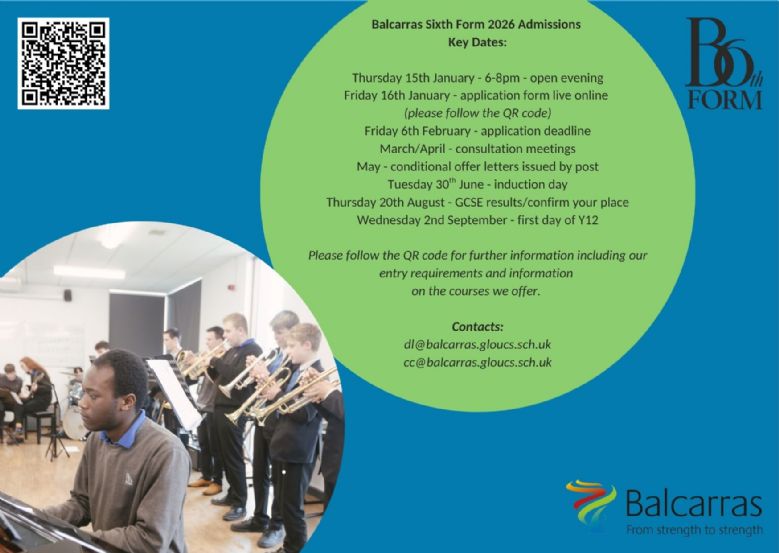 Please note our applications for Sixth Form 2026 will open on 16th January 2026. The application form will be a digital form and will appear here the morning after the open evening. For any questions regarding the admissions process, please contact Mrs Crowley: cc@balcarras.gloucs.sch.uk. Please note the deadline for the applications will be midnight on Friday 6th February 2026.