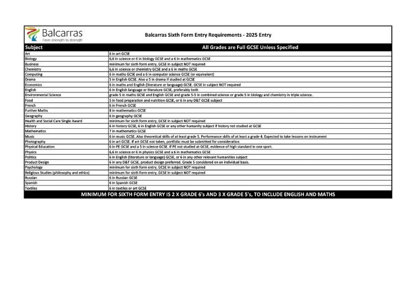 The minimum requirement for entry to the sixth form is 2 grade 6s and 3 grade 5s in full GCSE courses. These must include a grade 5 or above in both mathematics and English language or literature. In addition, many A-level subjects will require a specific grade in that particular subject at GCSE. Please view the below table or click here to review our Sixth Form entry requirements by subject .