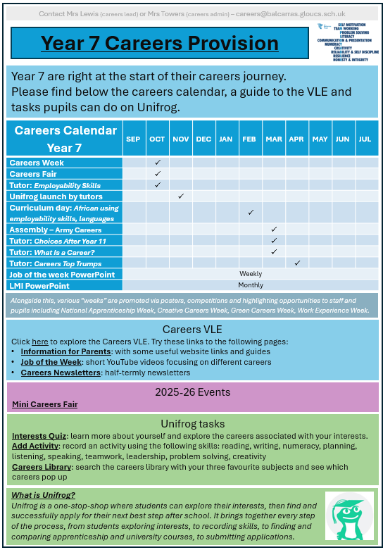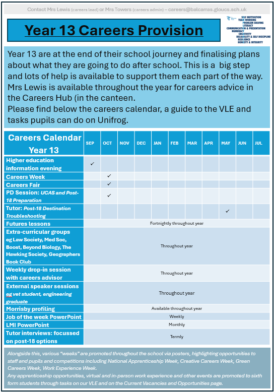 The development of CEAIG is a continual priority in the school’s strategic development plan with an aim to constantly improve the careers programme for students. The Careers Team and SMT meet on a regular basis to develop, monitor, and evaluate CEAIG (Careers, Education, Information, Advice and Guidance) across the school. Progress towards the Gatsby Benchmarks is evaluated using the online Compass tool (as recommended in Careers guidance and access for education and training providers). This is done using the Compass + platform tool throughout the year. The Careers Department also measures careers events and impact by using both student, parent and staff evaluation forms. Balcarras measures and assesses the impact of its careers programme for students regularly, in addition to a detailed annual review of progress. The careers programme is evaluated annually with the next review in summer term 2025.